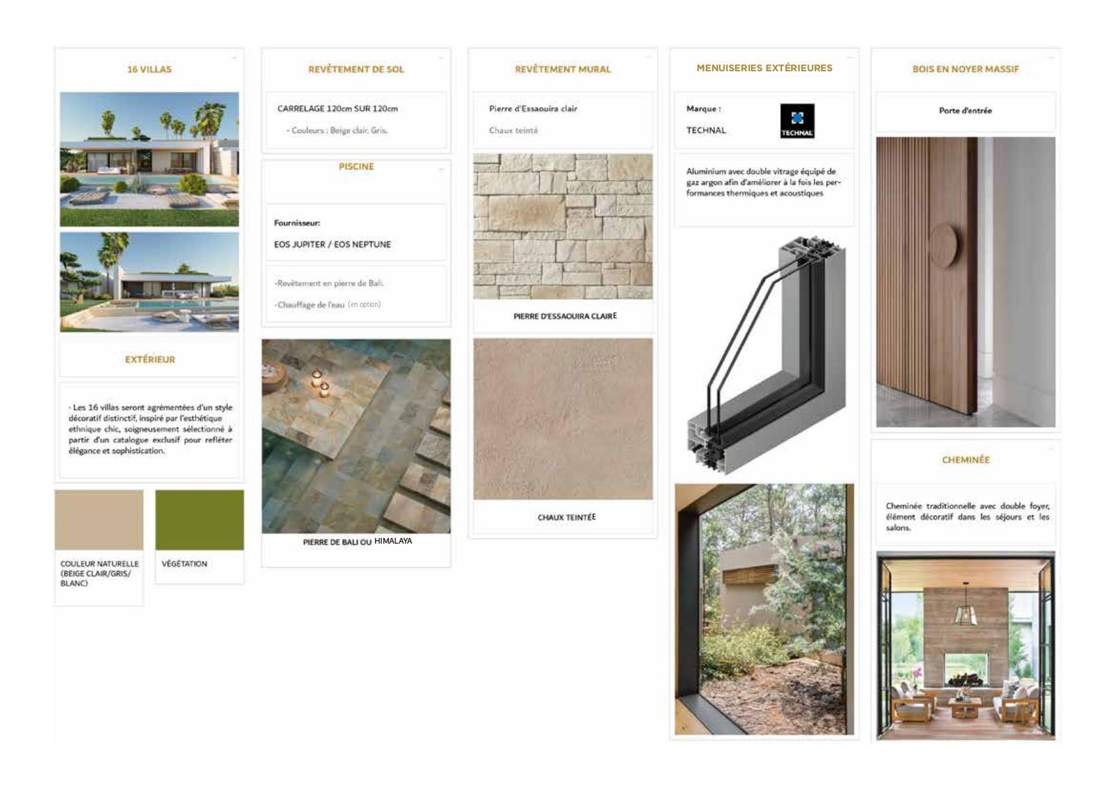 Pierre de Taza/Marbre, bois de noyer, baies TECHNAL à double vitrage, carrelage grand format 102×120 cm, plafonds décoratifs, domotique avancée, chauffage au sol, panneaux solaires, garage avec borne de recharge électrique, etc.